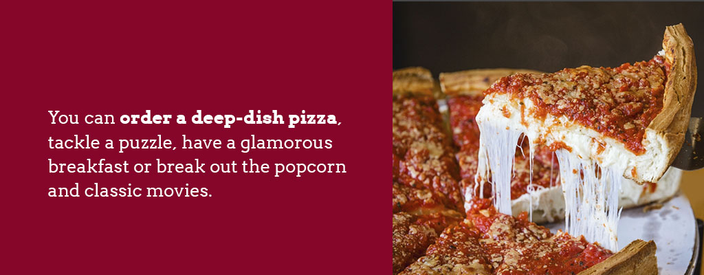 Your imagination is the limit when it comes to a day at home. You can order a deep-dish pizza, tackle a puzzle, have a glamorous breakfast or break out the popcorn and classic movies. Bring flowers and chocolates to her place and let the quality time begin.